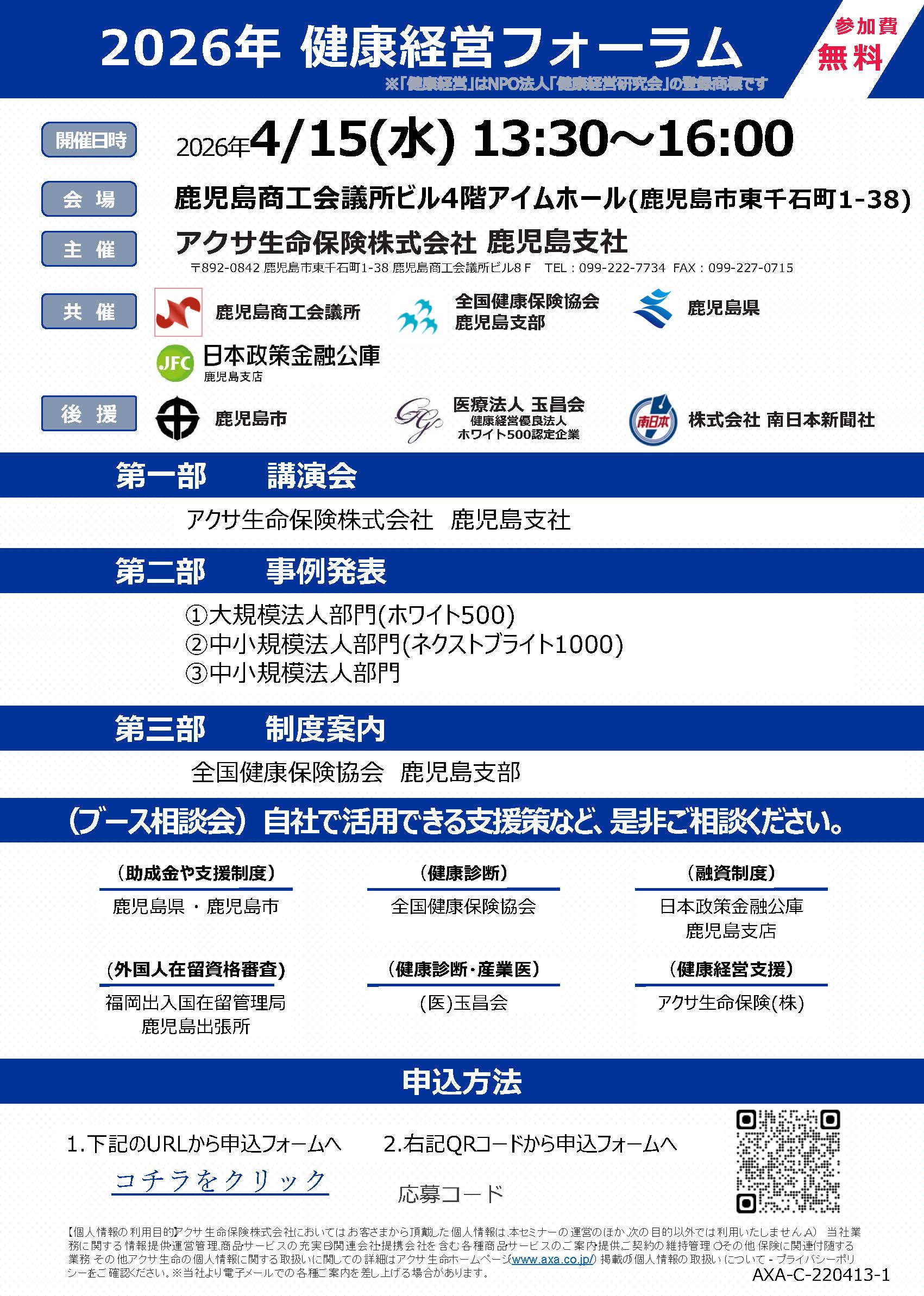 鹿児島商工会議所では、アクサ生命保険(株)鹿児島支社や鹿児島県、協会けんぽ鹿児島支部、日本政策金融公庫との共催で健康経営フォーラムを開催します。