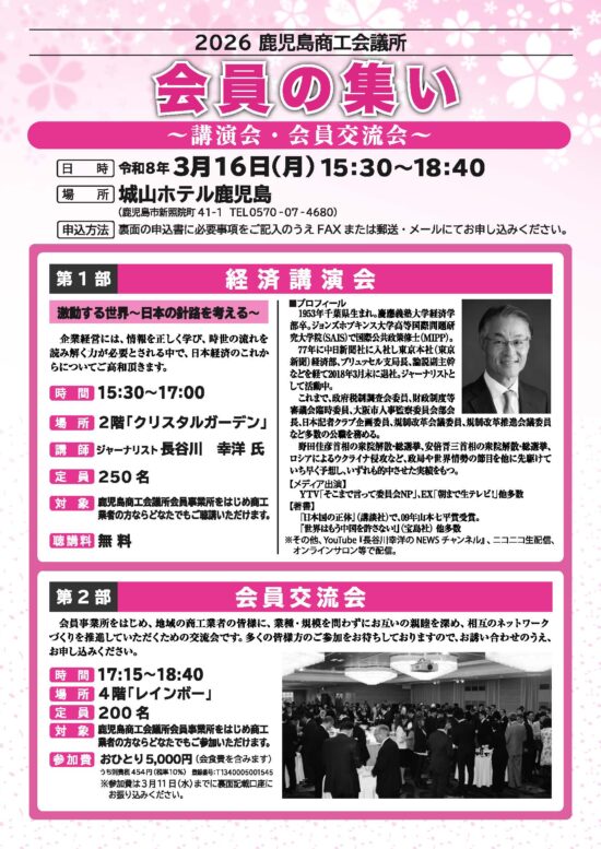 鹿児島商工会議所は、会員事業所・商工業者の皆様に、業種や規模を問わず、お互いに親睦を深め、新たなネットワークづくりに役立てていただくため、「会員の集い」(講演会・交流会)を開催いたします。
