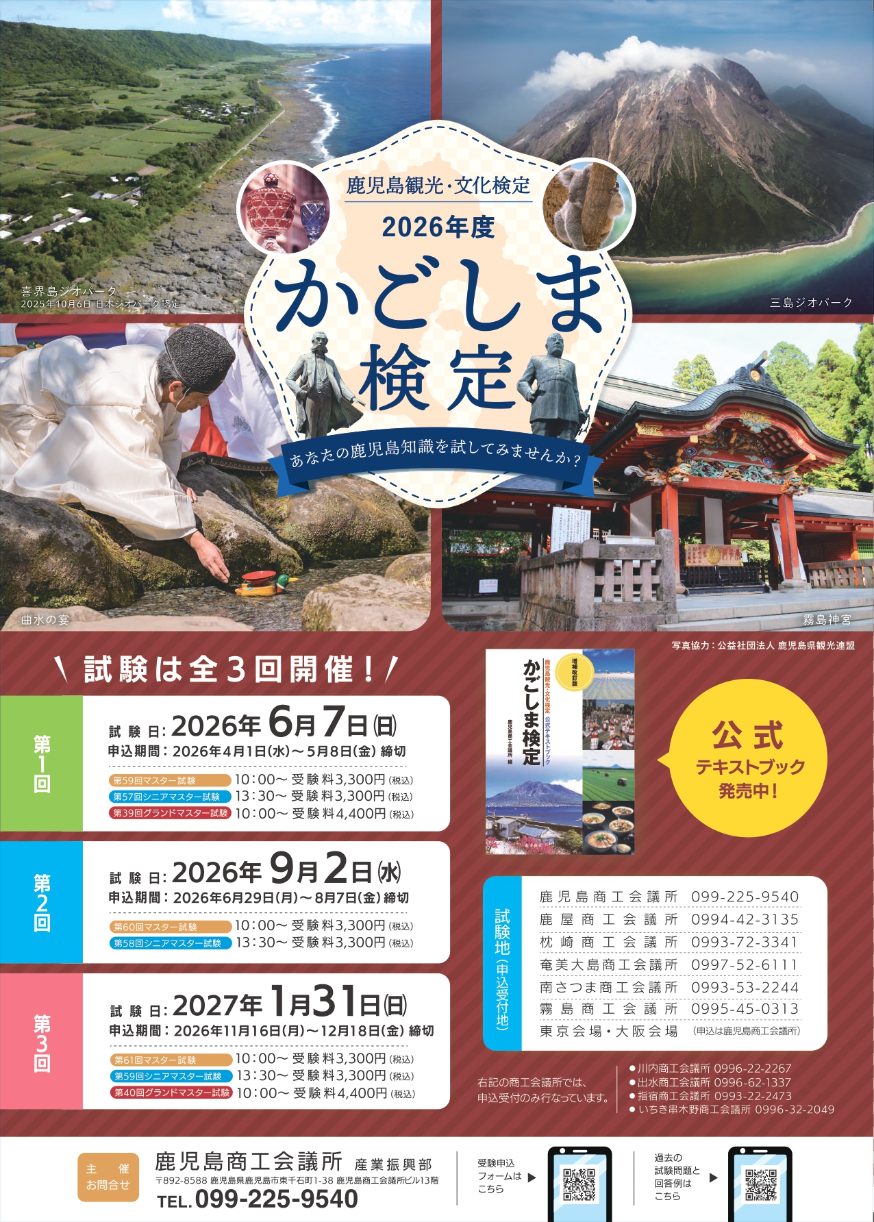 「かごしま検定公式テキストブック」を中心に、鹿児島の自然、歴史、文化、地域の特徴、政治・経済・産業の分野から出題。