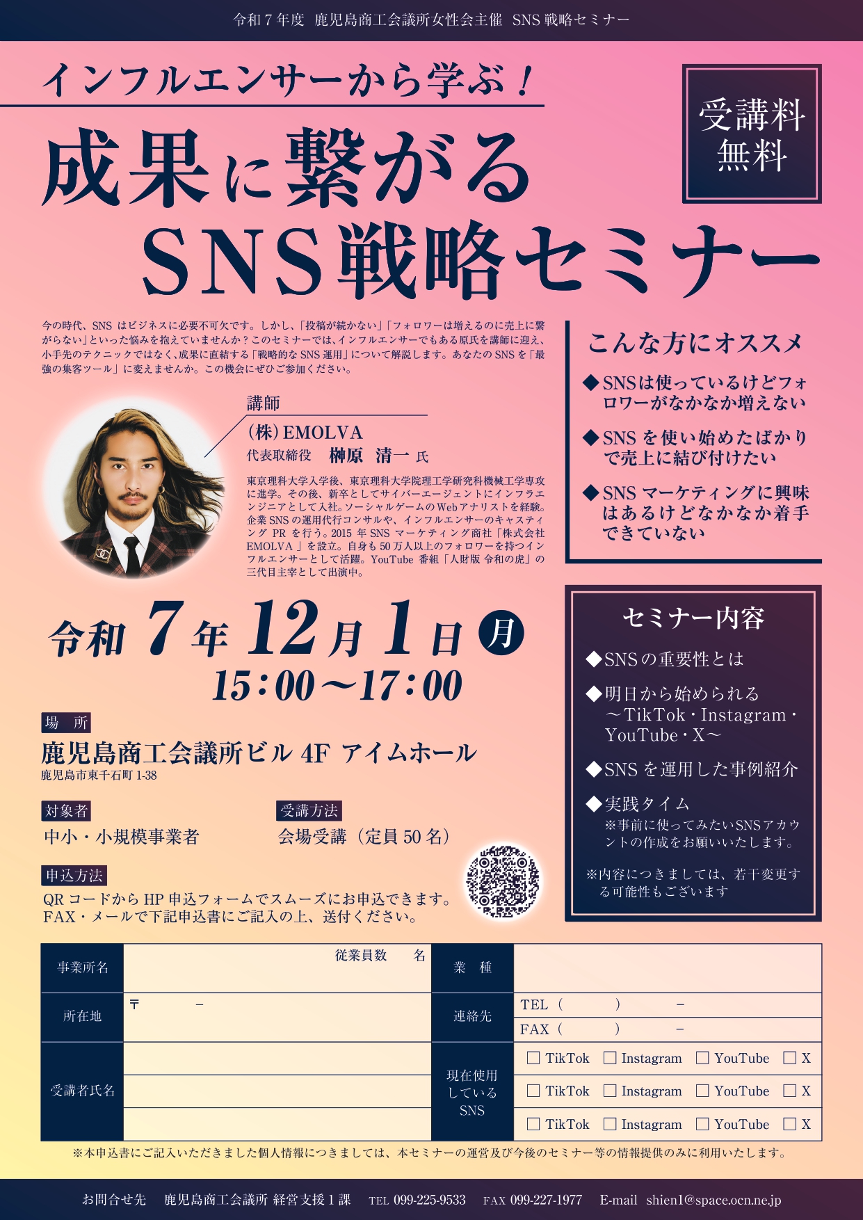 今の時代、SNSはビジネスに不可欠です。しかし、「投稿が続かない」「フォロワーは増えるのに売上に繋がらない」といった悩みを抱えていませんか?本セミナーでは、インフルエンサーでもある榊原氏を講師に迎え、小手先のテクニックではなく、成果に直結する「戦略的なSNS運用」について解説します。あなたのSNSを「最強の集客ツール」に変えませんか。この機会にぜひご参加ください。