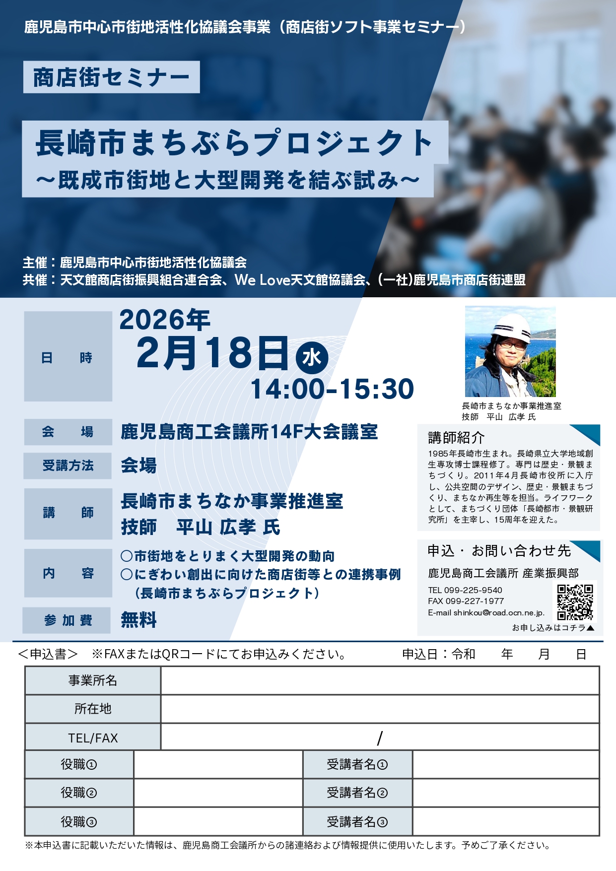 近年、鹿児島では中心市街地周辺における再開発事業が進んでおり、その動向が注目されております。そのような状況を受け、本セミナーでは、長崎市の大型開発の動向、にぎわい創出に向けた商店街等との連携事例についてご講話を頂きます。