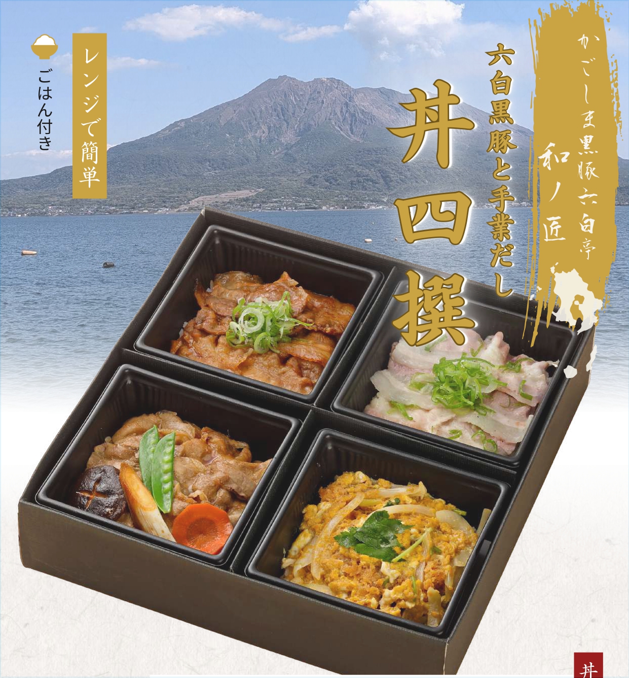 鹿児島県産の黒豚と伊佐米の炊き立てご飯を四種類味わえる丼四撰。電子レンジで温めるだけで、黒豚専門店の味を楽しめます。ご自宅や贈り物にどうぞ。