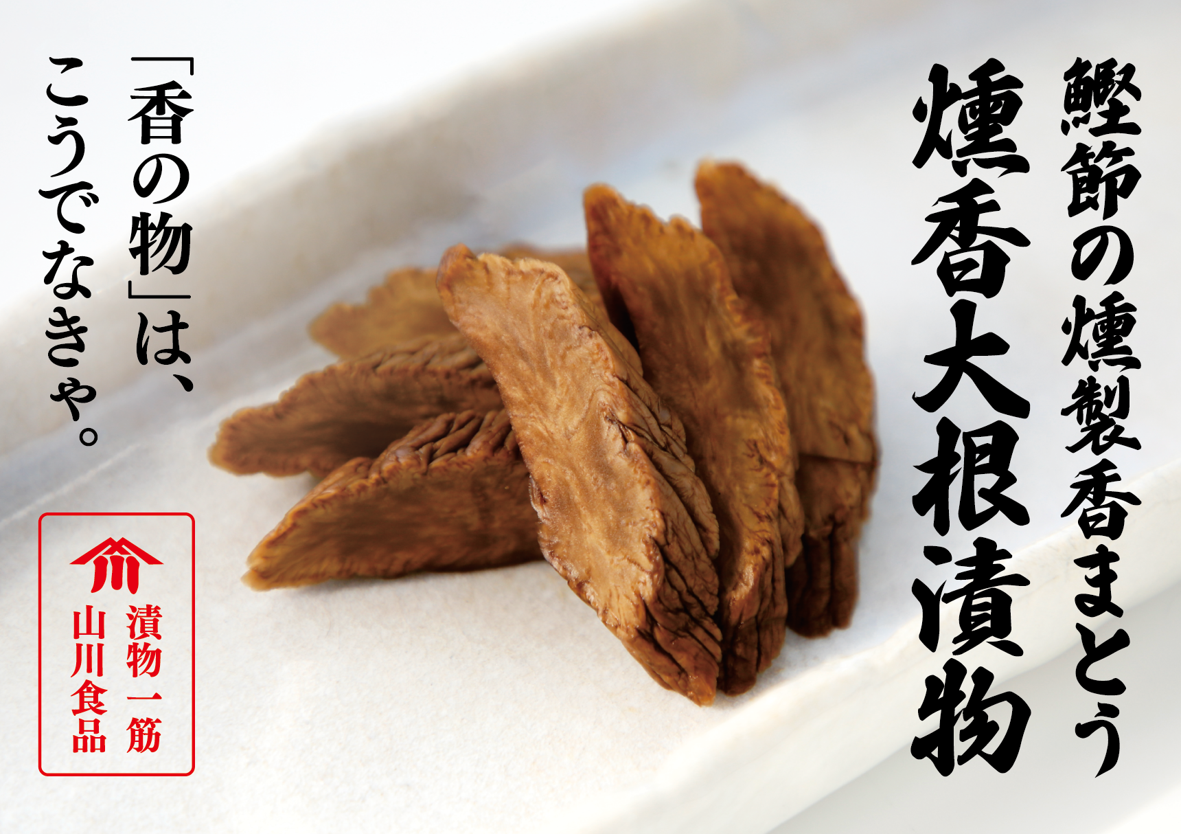 自社のルーツである山川町で特産品であった山川漬を同じく特産品の鰹節産業の協力のもと開発。いぶりがっこに引けを取らない確かな薫香と山川漬特有の歯ごたえをお楽しみください。