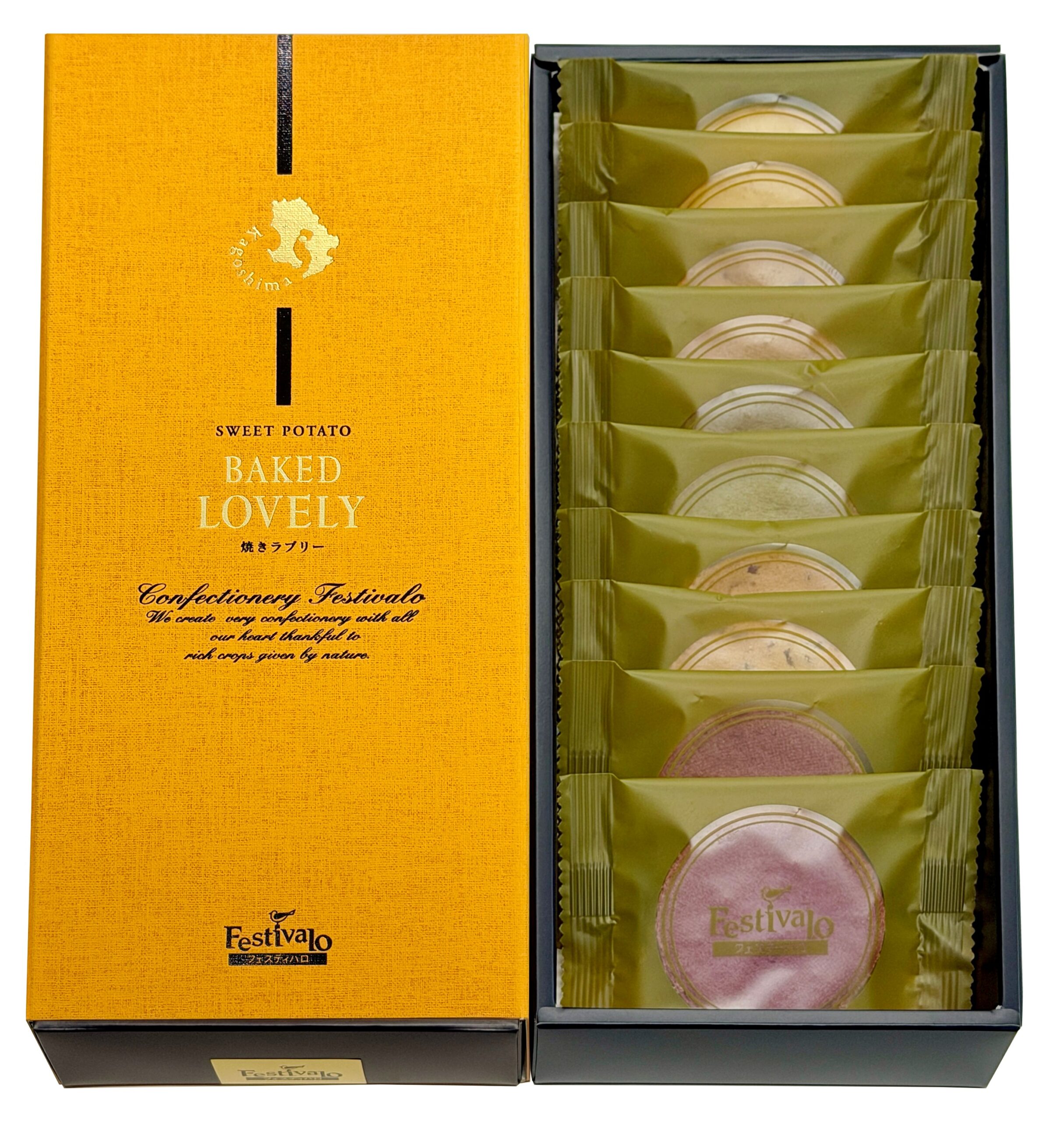 鹿児島の直営農場で元気に育ったさつま芋を使用。一番人気のラブリーの生地(黄金千貫)を、時間をかけて丁寧にじっくり焼き上げ、美味しさをぎゅっと閉じ込めました。小麦粉は使わず、食物繊維を使って、サクッとした食感としっとりとした口どけが楽しめるさつまいもの焼き菓子です。