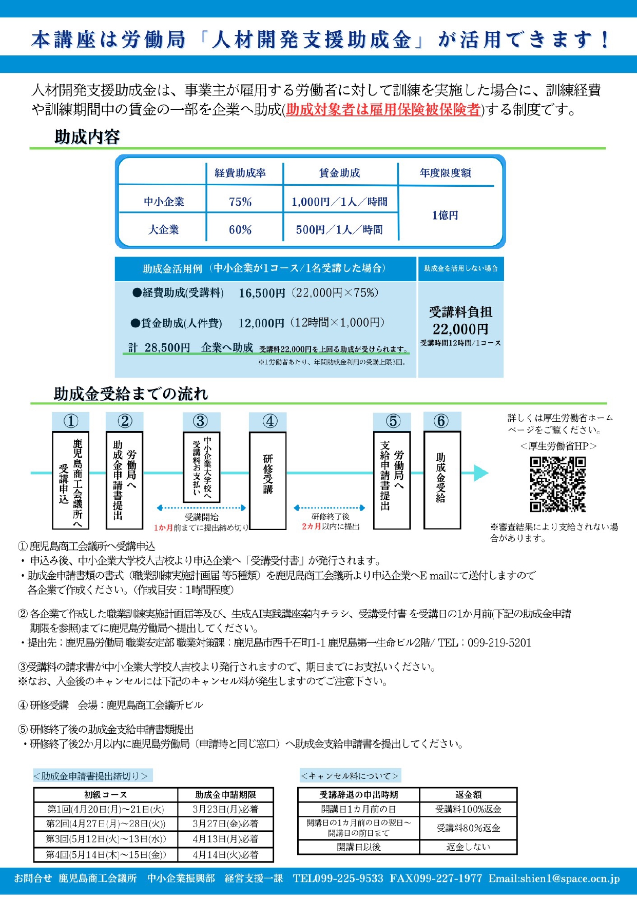 なお、本講座は厚生労働省の「人材開発支援助成金」の対象講座となっており、受講料等の助成を受けることができます。詳細は鹿児島商工会議所までお問い合わせください。